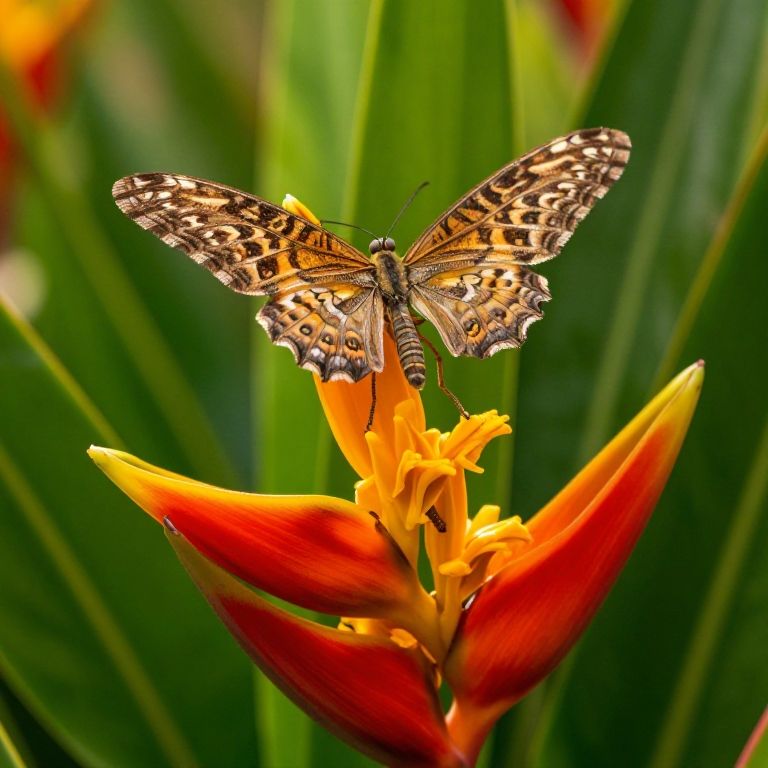 Photograph of a detailed butterfly with orange and black patterned wings perched on the vibrant yellow and red petals of a bird of paradise flower. The butterfly's wings are spread wide, showcasing intricate black spots on the orange background. The background consists of lush, green, elongated leaves, slightly blurred to emphasize the butterfly and flower. The bright colors of the flower and the delicate patterns on the butterfly's wings create a striking contrast. The image has a sharp focus on the butterfly and flower, with a soft bokeh effect in the background.