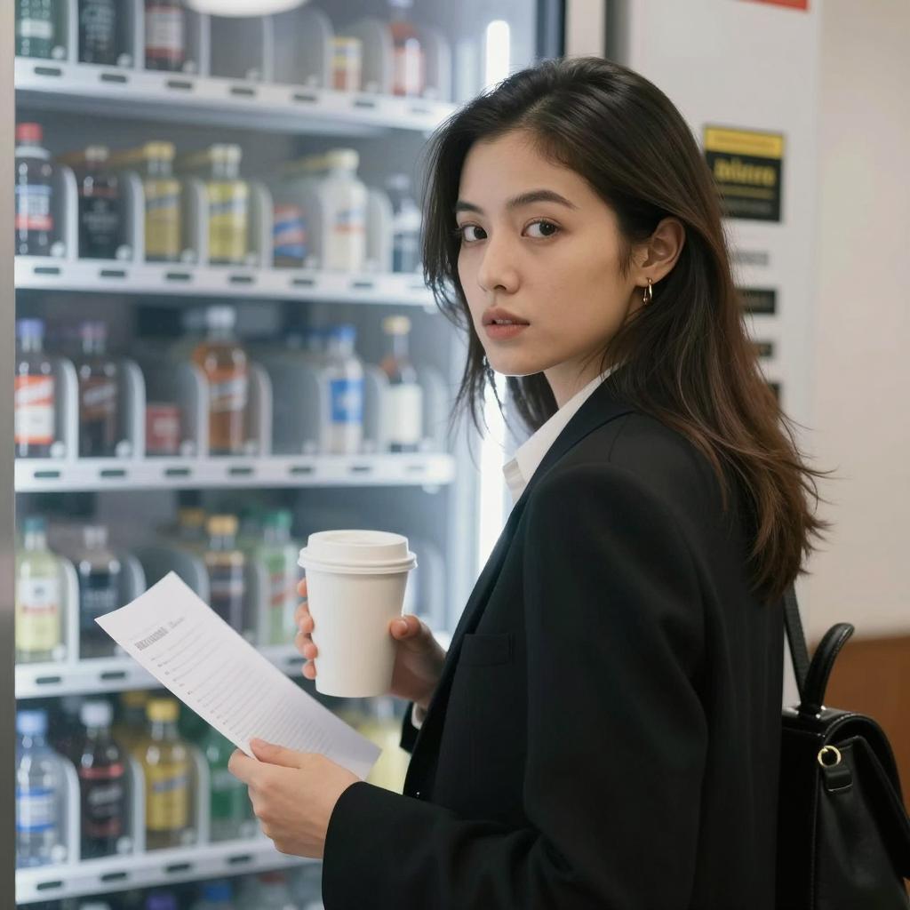 Woman with dark brown hair in a black suit jacket and white shirt, holding a paper and a white cup, standing in front of a metallic vending machine. She looks over her shoulder with a serious expression. Metal shelf with books in the background.