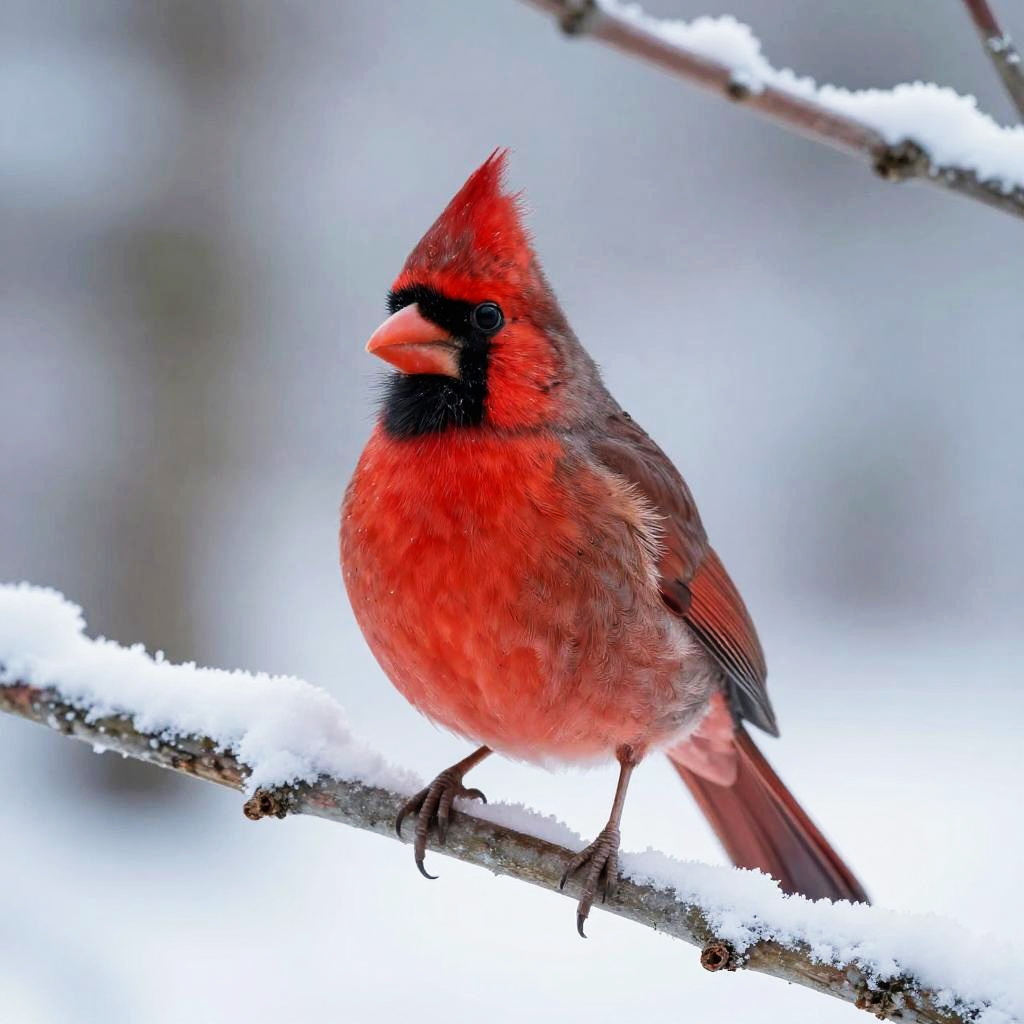 Highly detailed illustration of a bright red cardinal perched on a snow-covered branch, in a quiet winter forest, with clear crisp morning light with frosty air, soft textures, serene mood, intricate fur patterns, HD quality, gentle shadows, creating an inviting atmosphere for relaxation