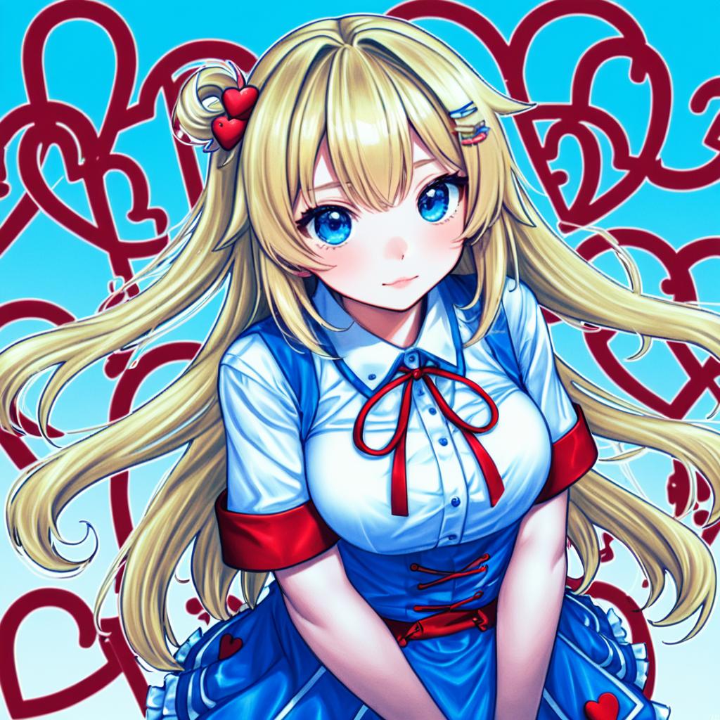 Akai haato (gothic lolita), hololive, 1girl, blue eyes, aqua eyes, hair between eyes, blonde hair, official alternate hairstyle, very long hair, heart hair ornament, x hair ornament, two side up, hair bow, hairclip, large breasts, medium breasts, red dress, virtual youtuber, virtual youtuber, by artist kloah, anime