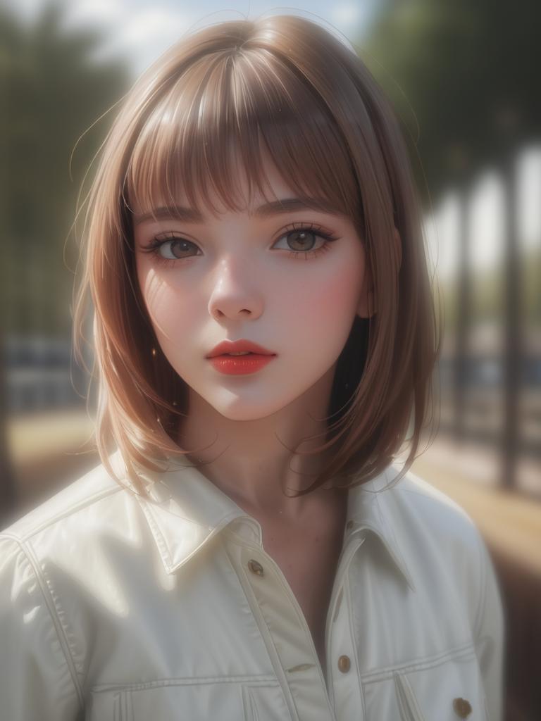 1girl, solo, realistic, long hair, blurry background, blurry, blonde hair, lips, shirt, upper body, one eye closed, white shirt, looking at viewer, day, depth of field, white dress, artist name, brown eyes, parted lips, outdoors, sleeveless, dress, nose, smile, watermark