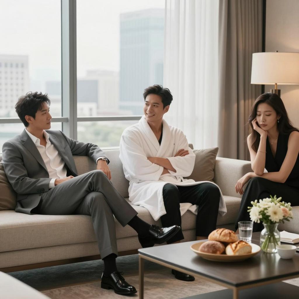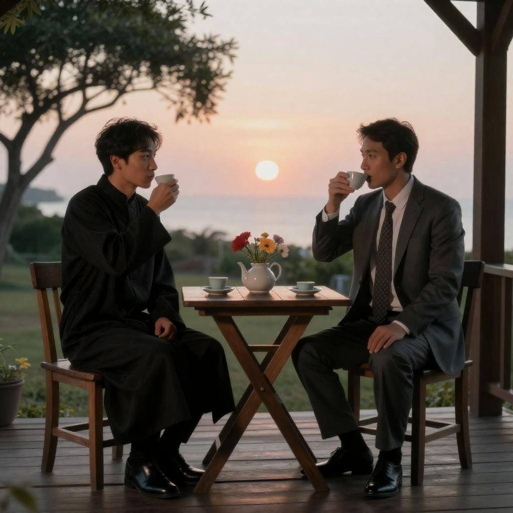 Two men sitting on a wooden porch at sunset, drinking from small cups. Left man in black robe, right man in grey suit with patterned tie. Both looking at each other. Wooden table with teapot and flowers between them. Trees and ocean in background. Right man holds cup in right hand, left man raises left hand.