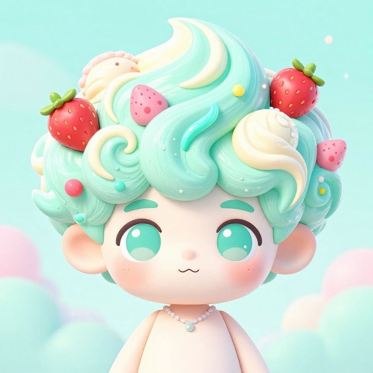 White boy with ice cream hair styled like colorful swirls of mint, strawberry, and vanilla, in a whimsical cartoon style, bright pastel background, playful and dreamy atmosphere, soft lighting, fantasy portrait.