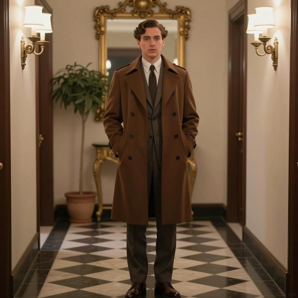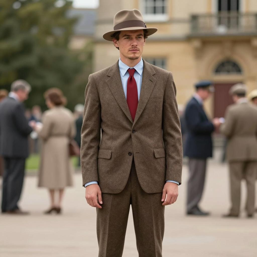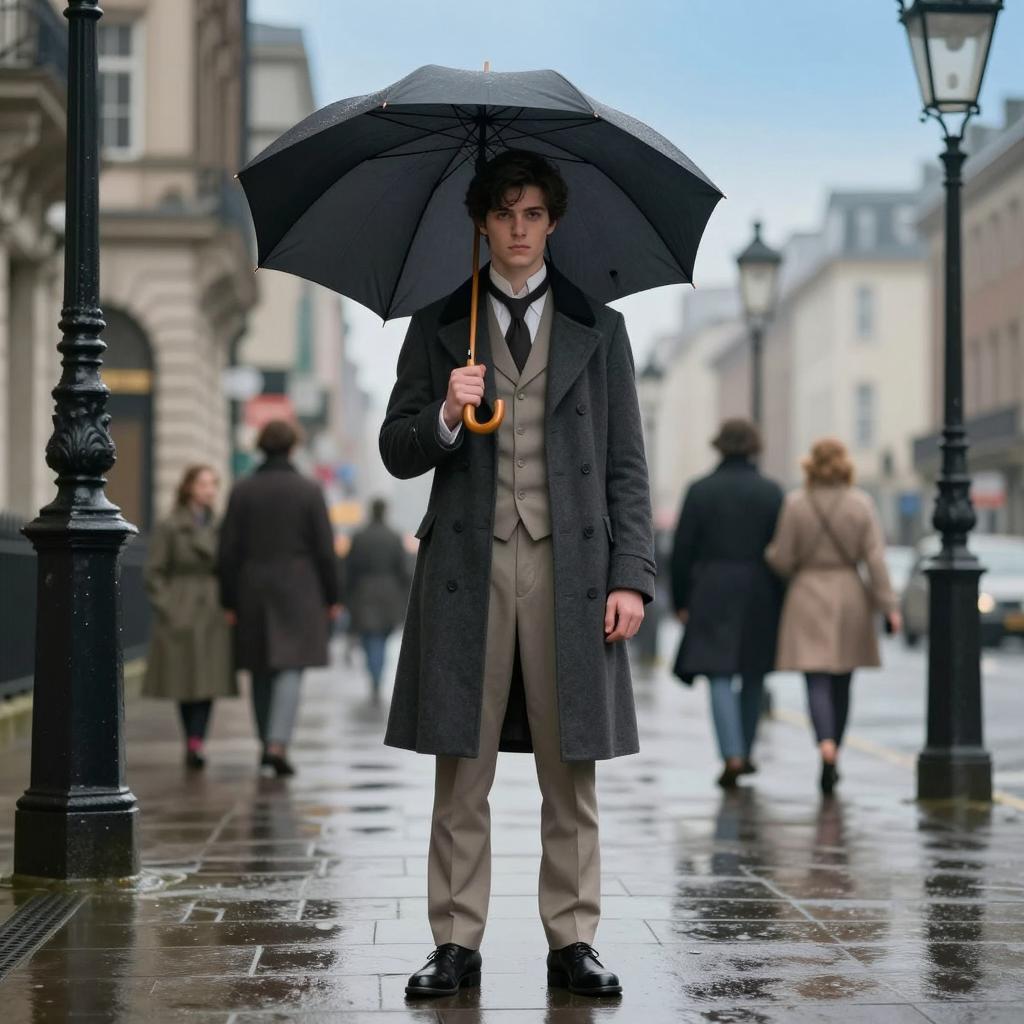 Umbrella academy five, photorealistic, young man, standing, holding black umbrella, Victorian-style, dark gray overcoat, beige suit, black shoes, short dark hair, serious expression, urban street background, blurred pedestrians, bright daylight, reflective pavement, ornate street lamps, high contrast, detailed ures, 19th-century fashion, front-facing, full body shot, clear blue sky, slightly wet pavement, vintage aesthetic, realistic lighting, people in background, standing confidently