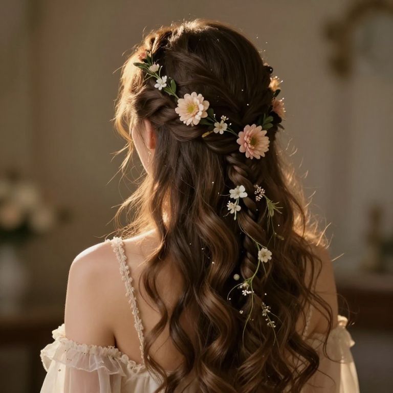 Cabelos longos trançados com detalhes florais, iluminação delicada e atmosfera romântica, estilo arte fantástica e mística com enfoque nos detalhes