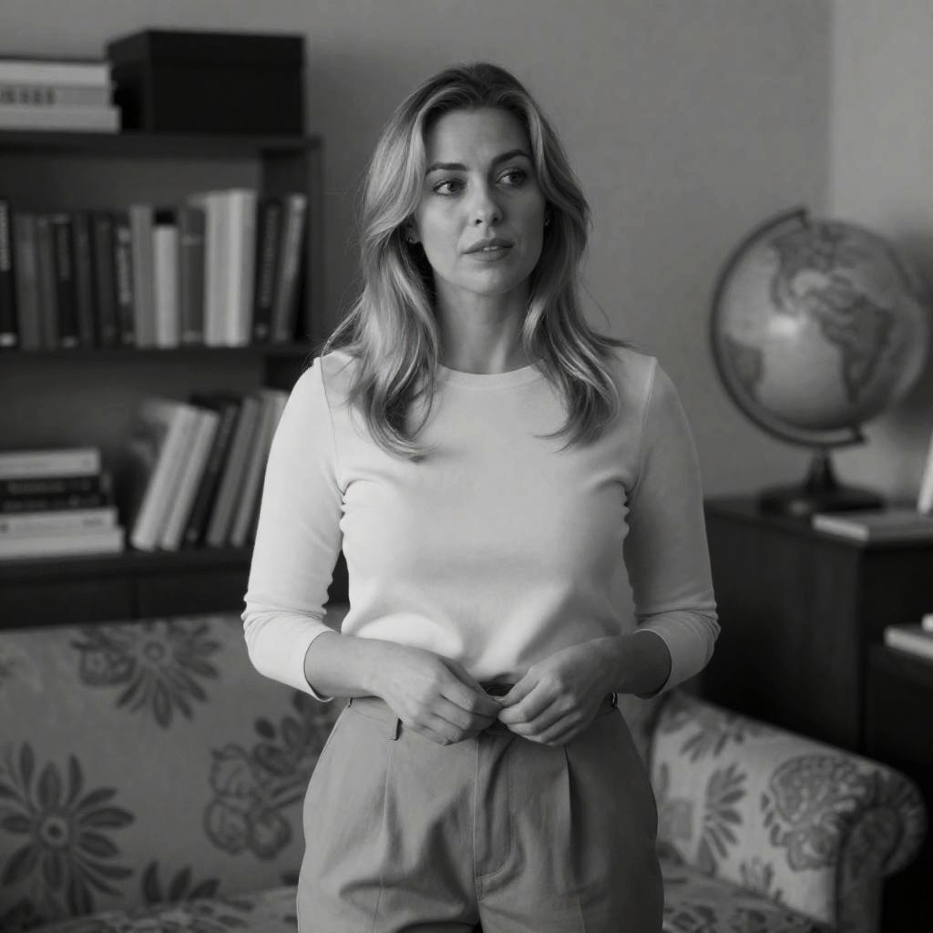 Photograph of a woman with wavy, light brown hair, wearing a gray blazer, black top, and dark purple scarf. She stands partially hidden behind a beige curtain, gazing to the side with a slight, contemplative smile. Soft, natural light filters through the curtain, illuminating her face and upper body. Dark, patterned background.