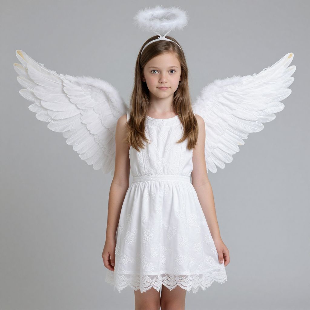 Photograph of a young girl with long brown hair, wearing a white angel dress, halo, and large white feather wings, standing against a plain gray