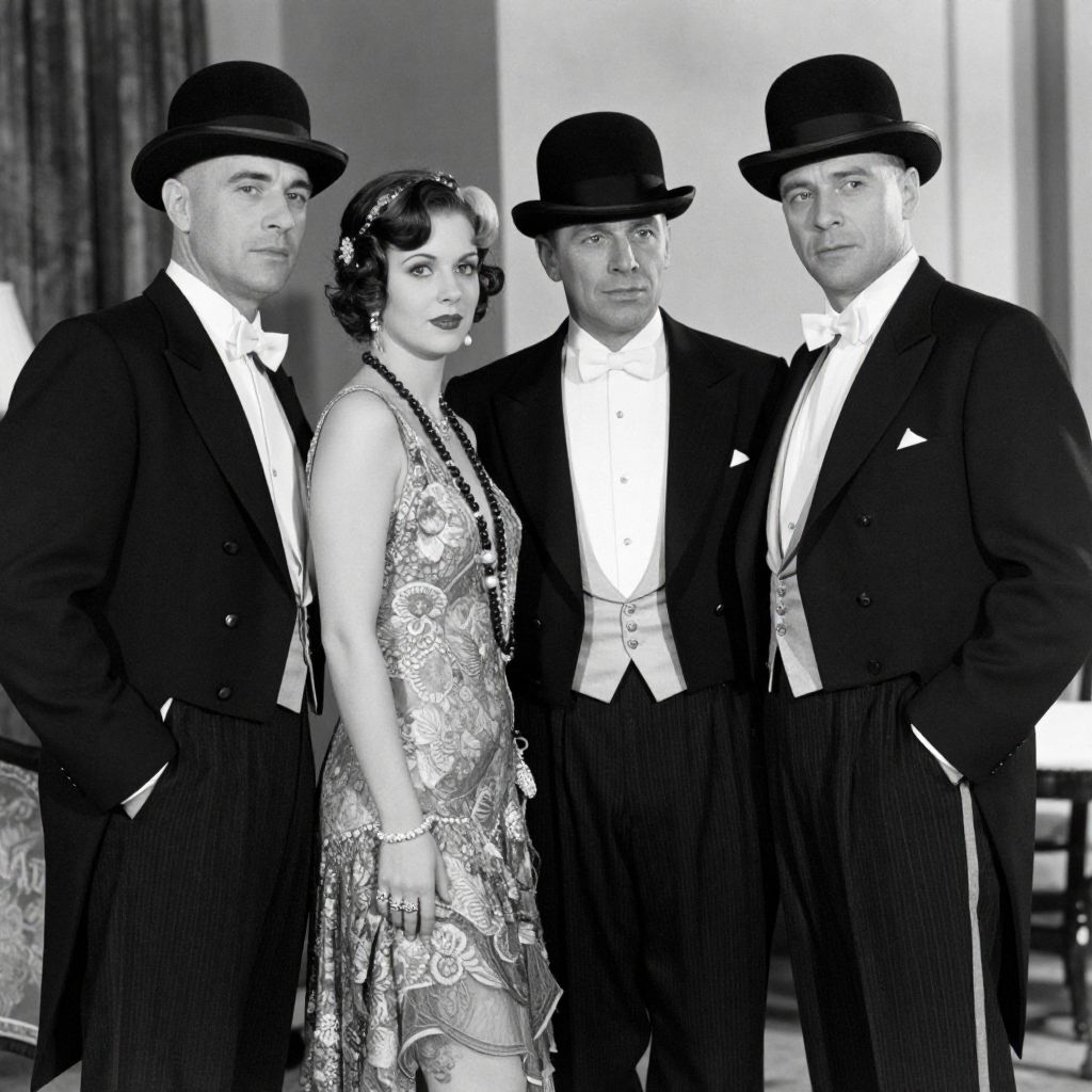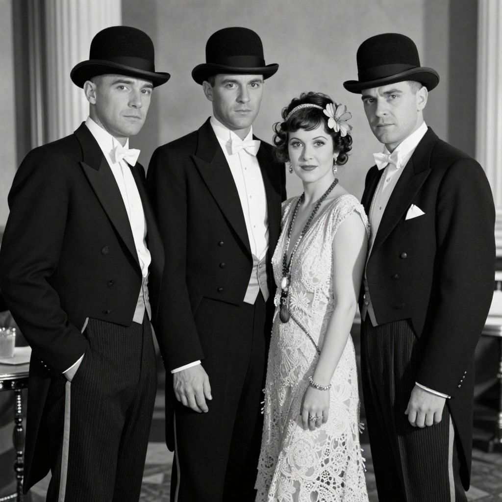 A black-and-white photograph captures a vintage, retro-style scene featuring three men in classic tuxedos and bowler hats alongside a woman in an elegant lace dress, evoking the glamour and sophistication of the entertainment company's Chicago talent gangsters and flappers era.