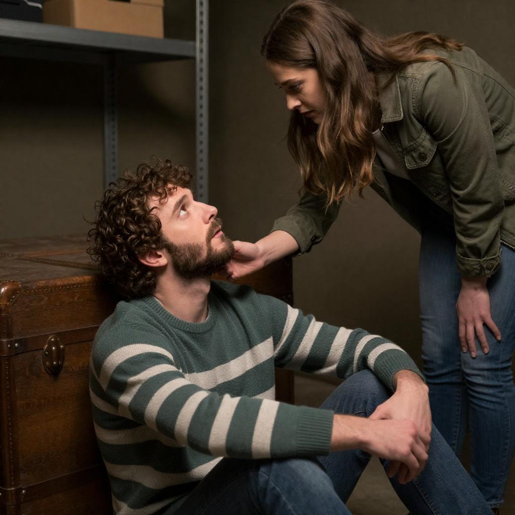 Photograph of a tense scene: a bearded man in a brown jacket pins a man with short dark hair and a green shirt to the floor in a cluttered, dimly lit room. Scattered papers, a bicycle, and wooden furniture are in the background. The pinned man looks distressed, while the bearded man appears focused.