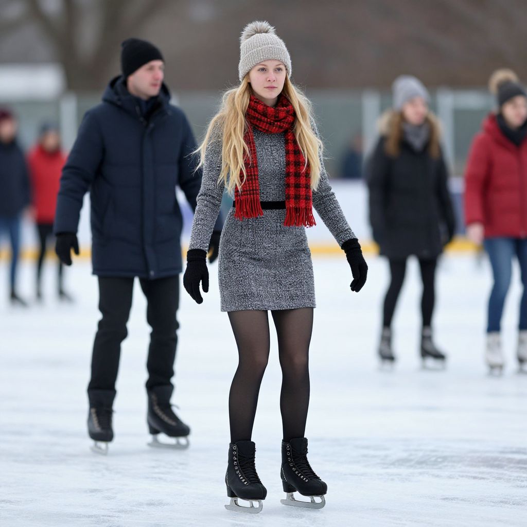 Photograph of a young Caucasian woman with long blonde hair, wearing a white knitted beanie, red plaid scarf, grey wool coat, black tights, and black ice skates. She is standing on a frozen outdoor rink with a blurred background of other skaters, including a man in a black coat and beanie to her left and a woman in a red coat to her right. The ice surface is bright white, contrasting with the dark winter clothing and the woman's vibrant scarf. The background includes leafless trees and indistinct structures.