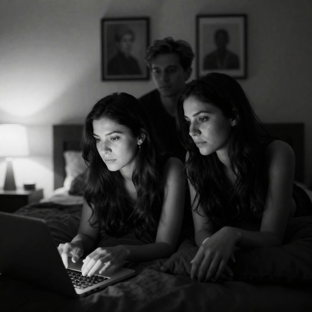 Black and white photograph of three people in a room. Two women with curled hair and one man with slicked-back hair. Man on left, woman in center with lace dress, woman on right with dark hair. Large open book on table. Woman in center looking forward, man looking at book, woman on right looking down. Overhead lamp in background.