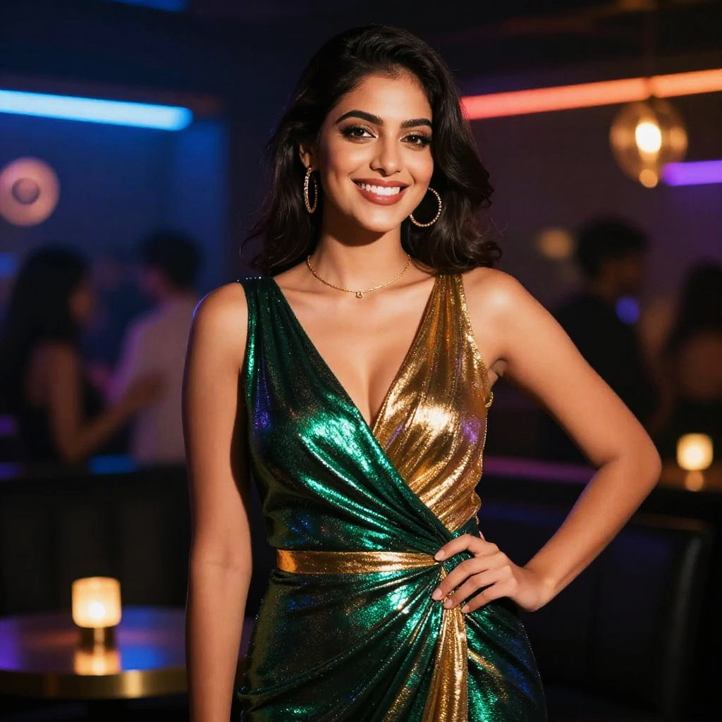 This vibrant image showcases a confident woman in a stunning green sequined gown, exuding a trashy yet sassy style. The neon lights of the urban setting illuminate her glamorous appearance, embodying a lively nightlife atmosphere reminiscent of artistic street culture.