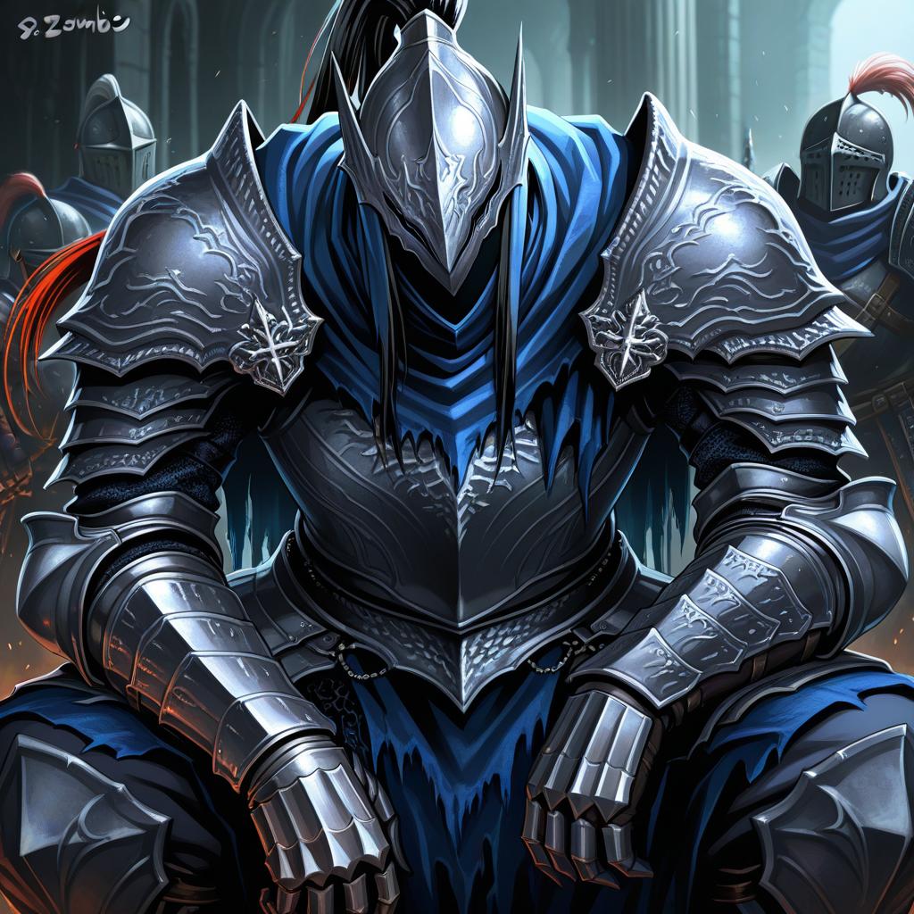 Artorias the abysswalker, dark souls (series), 1boy, full armor, helmet, full armor, knight, gauntlets, knight, plume, pauldrons, by artist studiozombie, illustrious