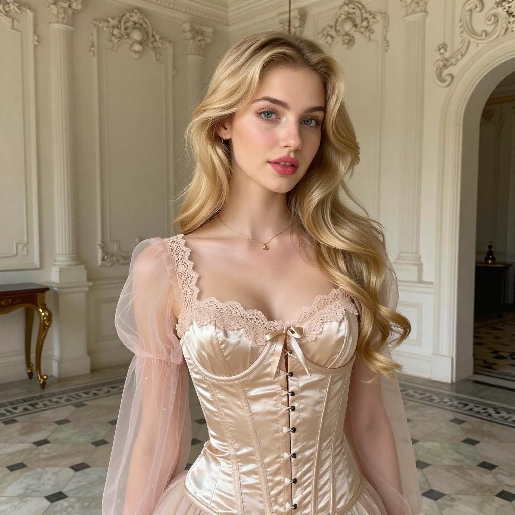 Photograph of a young woman with long, wavy blonde hair and fair skin, wearing a shiny, beige corset with lace trim and sheer pink sleeves. She has blue eyes, pink lipstick, and a gold necklace. She stands in an elegant, ornate room with cream-colored walls and patterned black-and-white tile flooring, looking slightly to the side with a gentle expression.