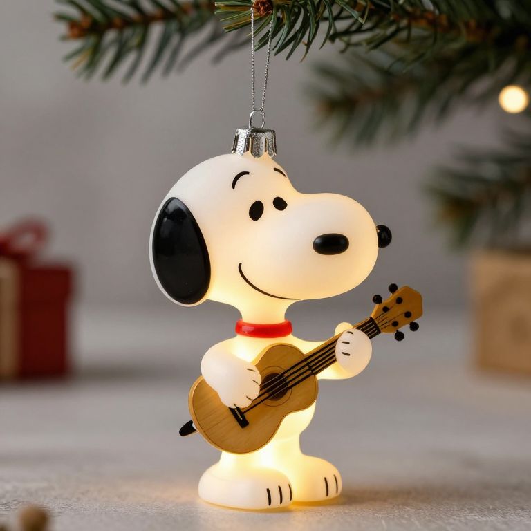 Photograph of a glowing Charlie Brown Christmas ornament playing a miniature guitar, hanging from a tree branch, with blurred gift boxes in the background.