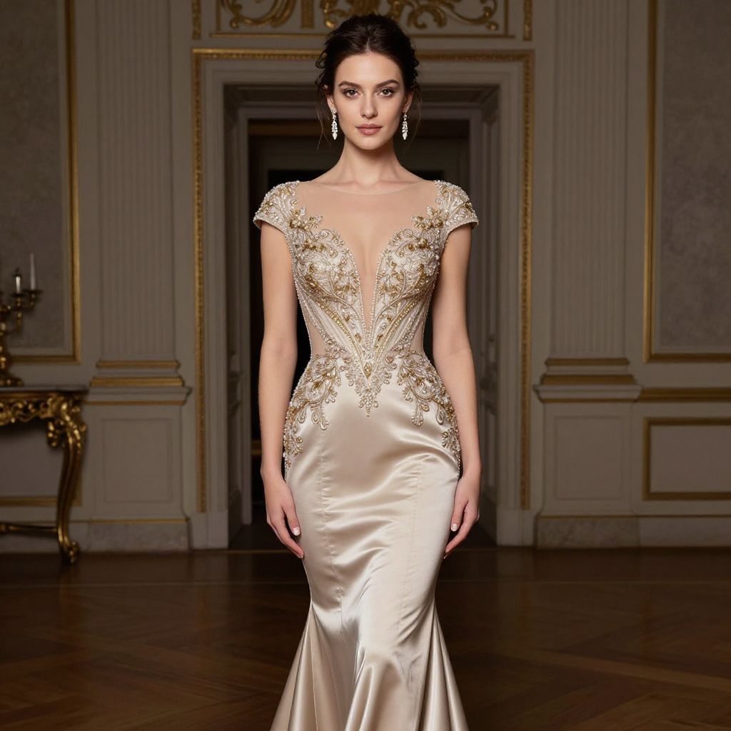 A Petite woman, sophisticated glamour, fitted mermaid gown in champagne satin, sheer illusion neckline, cap sleeves, intricate gold beading and embroidery on bodice, semi-sheer back with embellishments, curve-hugging silhouette flaring at the knee, elegant updo hairstyle, drop earrings, Formal reception in a historic mansion. visual style: camera obscura Sexy. Pretty face and beаutiful eyes. Big breasts
