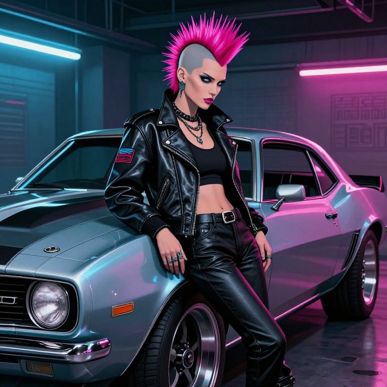 Digital artwork of a punk woman leaning against a neon-lit, grey muscle car in a dimly lit garage. She has a bright pink mohawk, pale skin, and bold makeup. She wears a black leather jacket with an American flag patch, a black crop top, and black leather pants. Her fingers are adorned with rings, and she has a choker necklace. The car's chrome details and black trim are visible, with neon pink and blue lights casting a colorful glow on the scene. The background features industrial elements and a partially visible garage door. The style is vibrant and edgy, emphasizing punk culture.