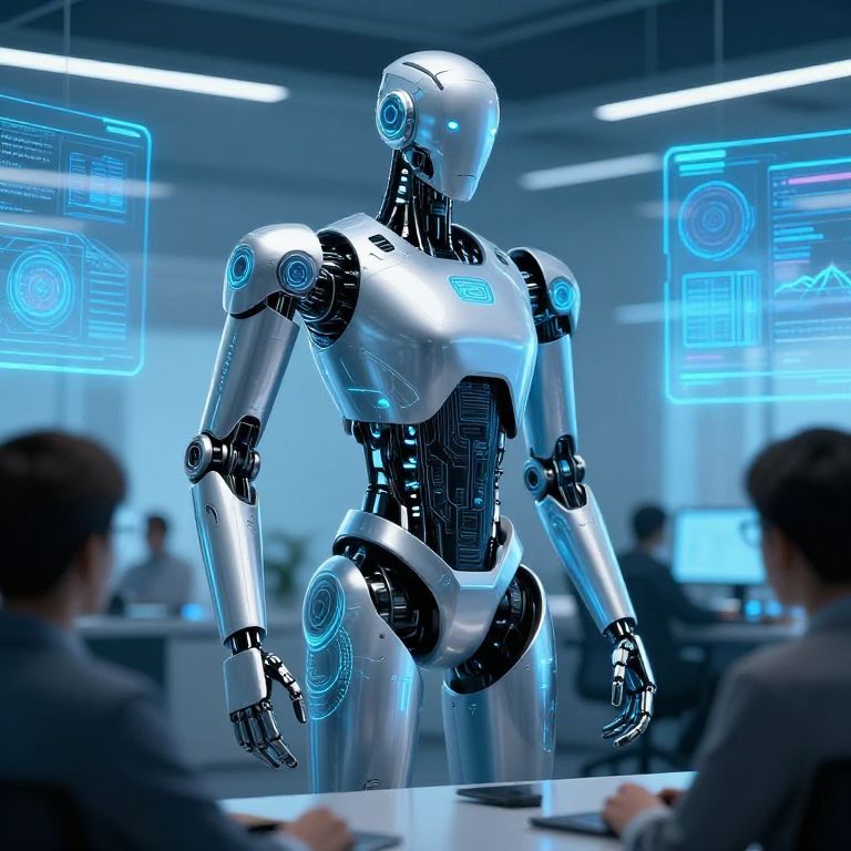 AI portn concept art, an advanced robotic assistant with sleek metallic limbs, intricate digital patterns on its surface, interacting with humans in a modern office environment filled with virtual holograms and ambient blue lighting, sci-fi atmosphere