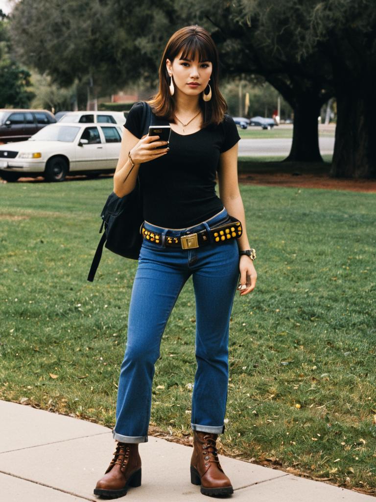 Pulp fiction mia costume, 1girl, solo, bag, long hair, phone, cellphone, earrings, pants, jewelry, brown hair, boots, belt, outdoors, smartphone, backpack, full body