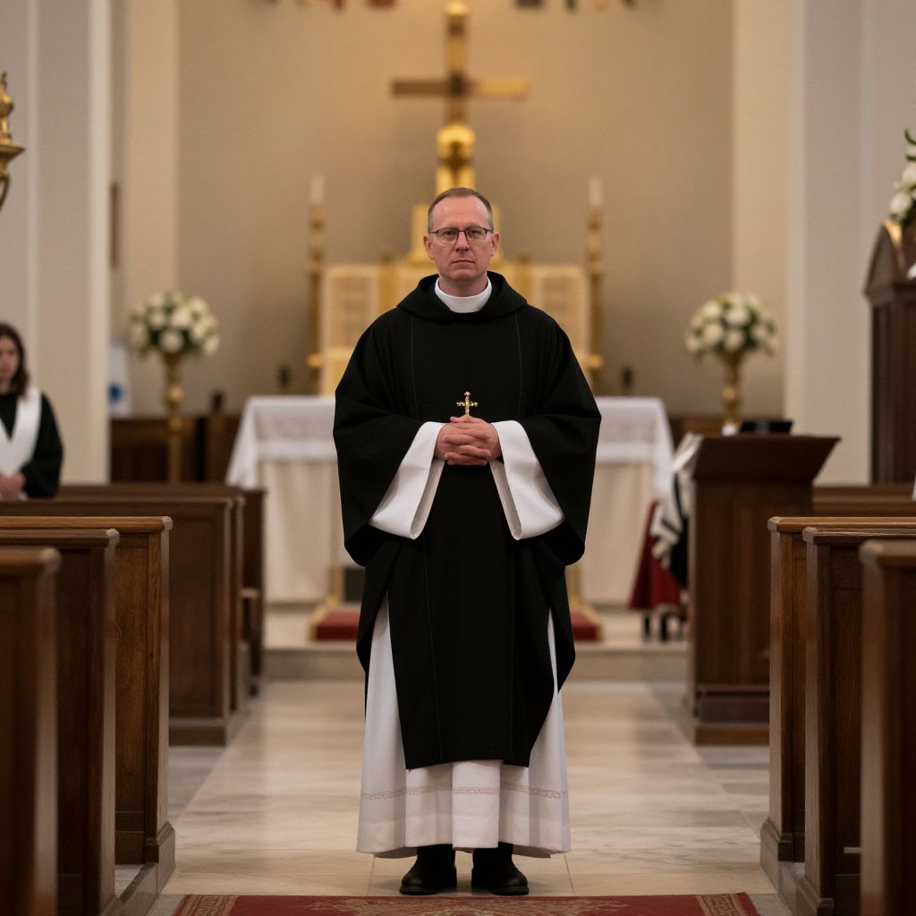 "Formal Attire Church, man in a priest ' s robes standing in a church"