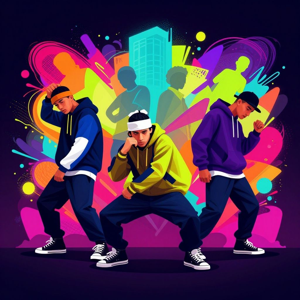 Vector illustration of three hip hop dancers in hoodies and sneakers against a vibrant, colorful graffiti-style background with abstract human silhouettes. Urban street dance concept with dynamic poses and splashes of neon colors on a dark backdrop.