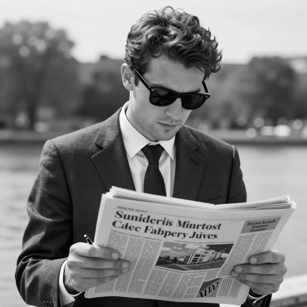 Black and white photograph of a man with short, wavy hair and dark sunglasses. He wears a dark suit, white shirt, and black tie, holding a folded newspaper in his right hand. He looks down intently at the newspaper. Trees and a water body are in the blurred background. The man's facial expression is focused. He has a small pen or item in his left hand.