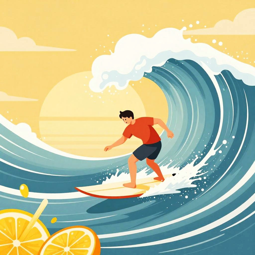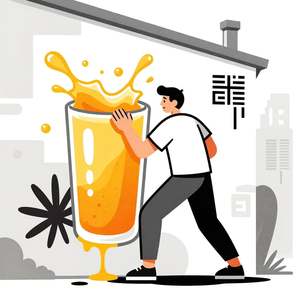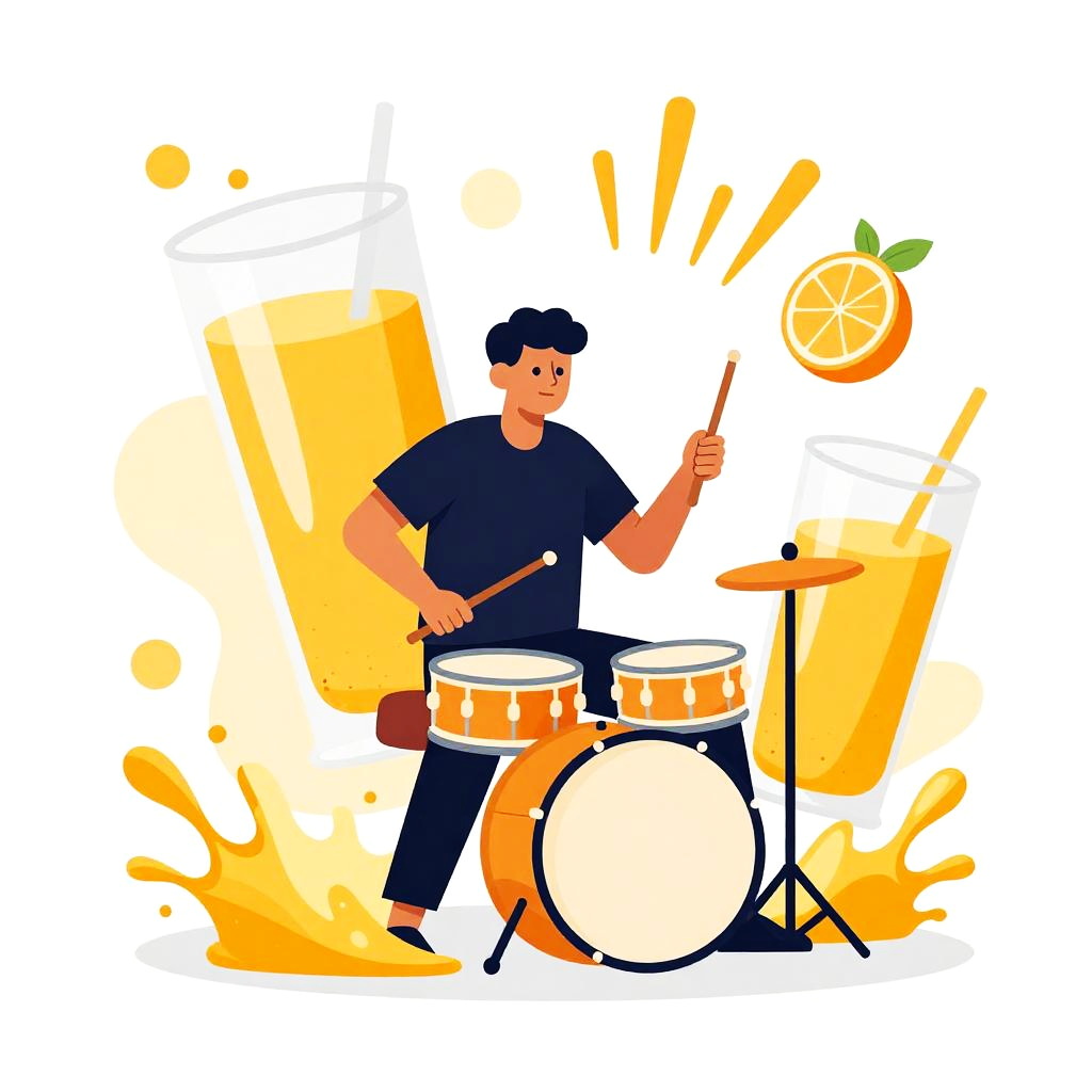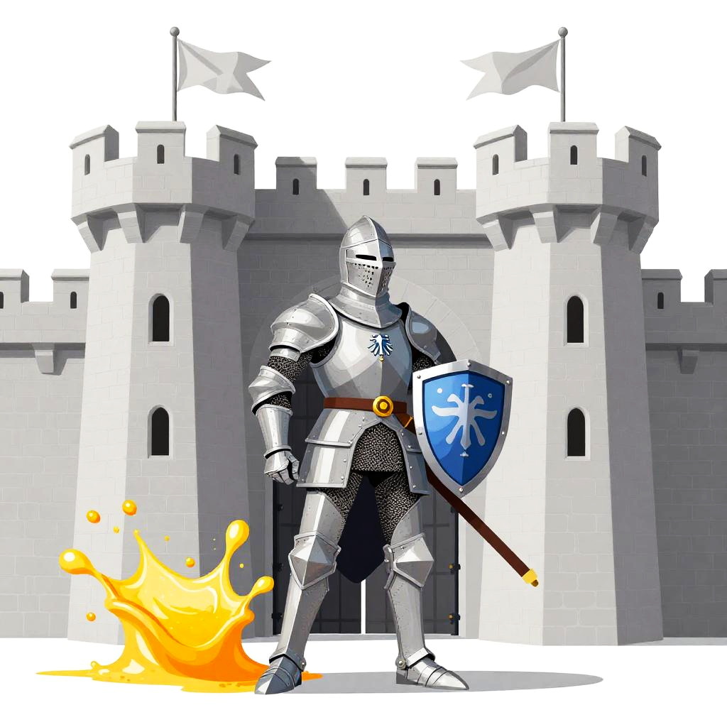 A comic-style illustration of a knight defending a castle gate, with splashing orange juice and shield reflections and banner flutters. Flat mono-color background, cel shading, HDR, crisp and clean design