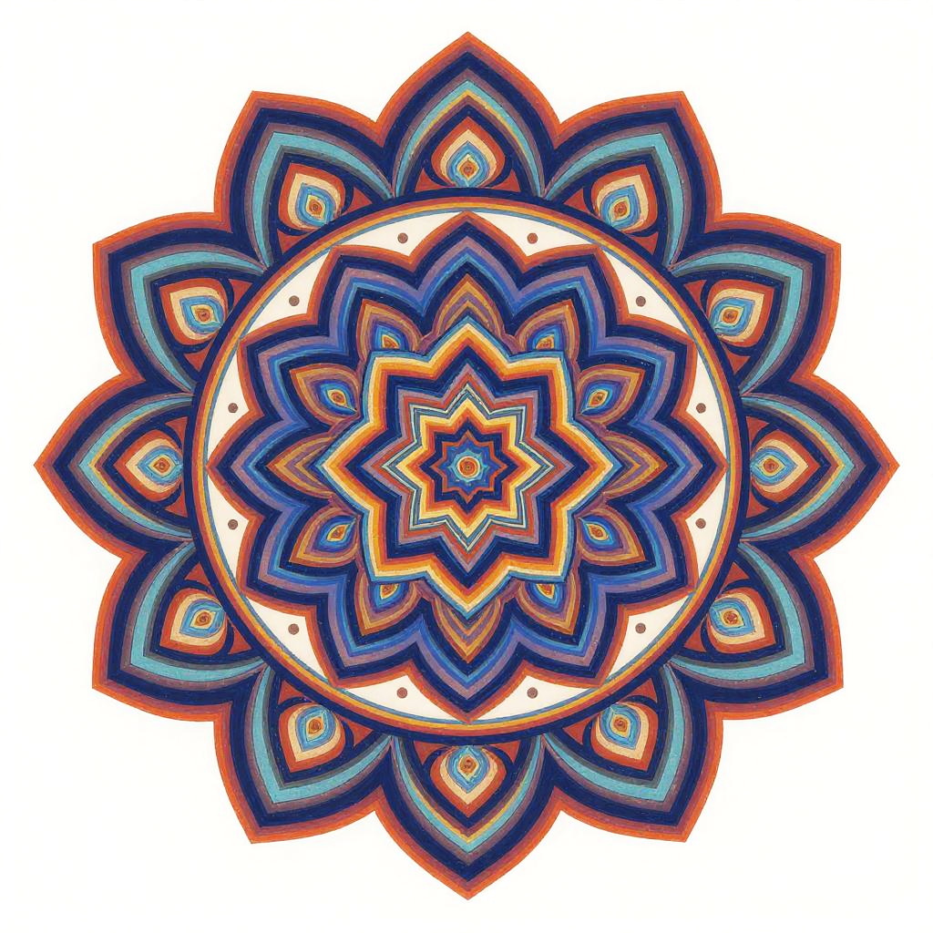 AI drawing of an intricate digital mandala created through algorithmic design, vibrant symmetrical patterns radiating outward, rich color palette with hypnotic detail, showcasing the mathematical beauty generated by artificial intelligence.