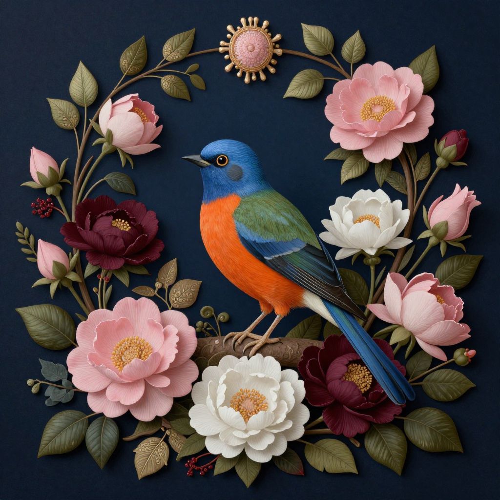 Digital illustration of a vibrant bird with a blue head, orange chest, and green wings, perched on a circular floral wreath against a dark blue background. The wreath features pink, white, and maroon peonies, with green leaves and small red berries. The bird's detailed feathers contrast with the soft, textured petals and leaves. The composition is symmetrical, with the bird centered, creating a balanced and elegant visual. The style is realistic with a touch of fantasy, emphasizing rich colors and intricate details.