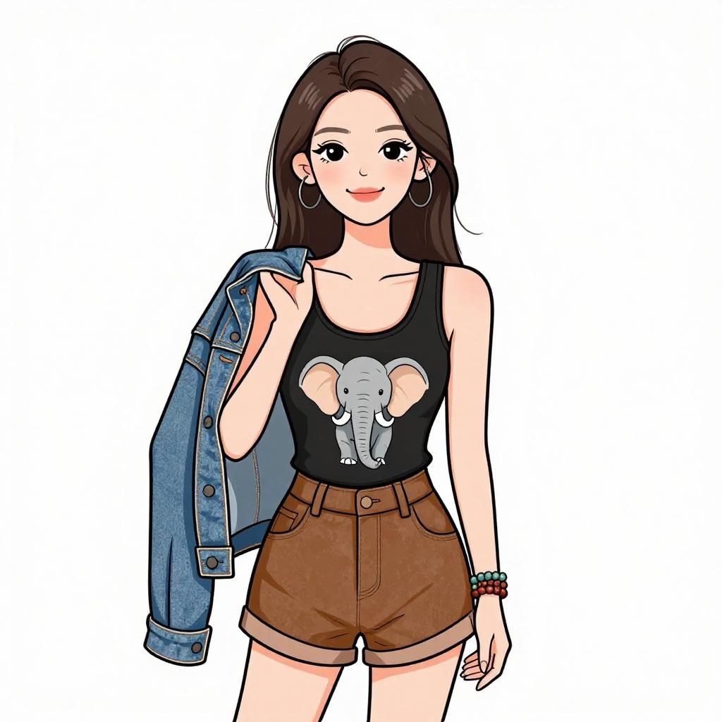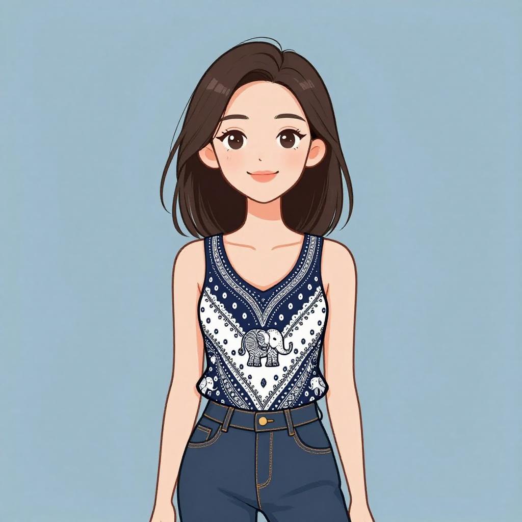 Woman with pretty face and pretty hair. smiling Woman, casual, burgundy t-shirt with white tribal elephant print, crew neck, short sleeves, tucked into blue denim jeans, mid-rise, slim fit, brown belt with geometric patterned buckle. --sref 1467