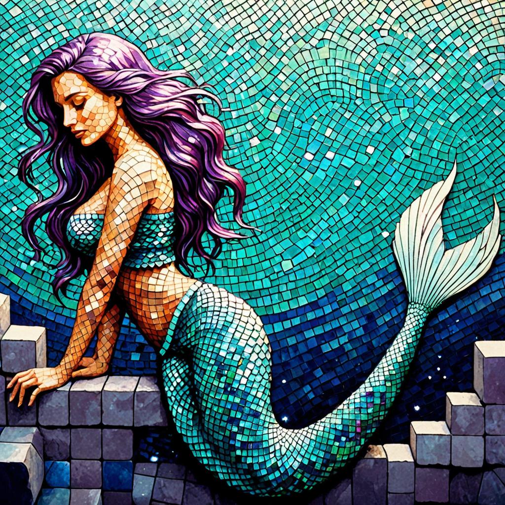 A detailed digital artwork of a graceful mermaid created with a mosaic of small, colorful scales forming a pixelated effect. The mermaid features long flowing lavender hair and a shimmering aqua tail and top. The background is composed of aqua and blue mosaic tiles arranged in a swirling pattern, enhancing the fantasy style and luminous quality of the piece.