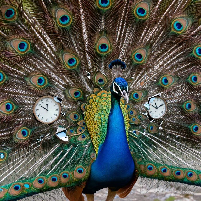 A digital artwork featuring a vibrant peacock with a kaleidoscopic tail composed of intricately arranged, shattered clocks, symbolizing the unraveling and rewriting of moments in the observer's personal timeline, rendered in a high-definition, surrealistic style with dynamic lighting effects.