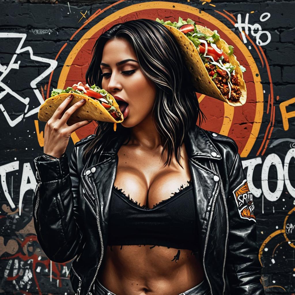 Vector illustration of a gritty graffiti-style hip-hop female character with extra large cleavage, wearing a ripped dark leather jacket and black crop top, enjoying a large spicy taco in front of a graffiti-covered wall.
