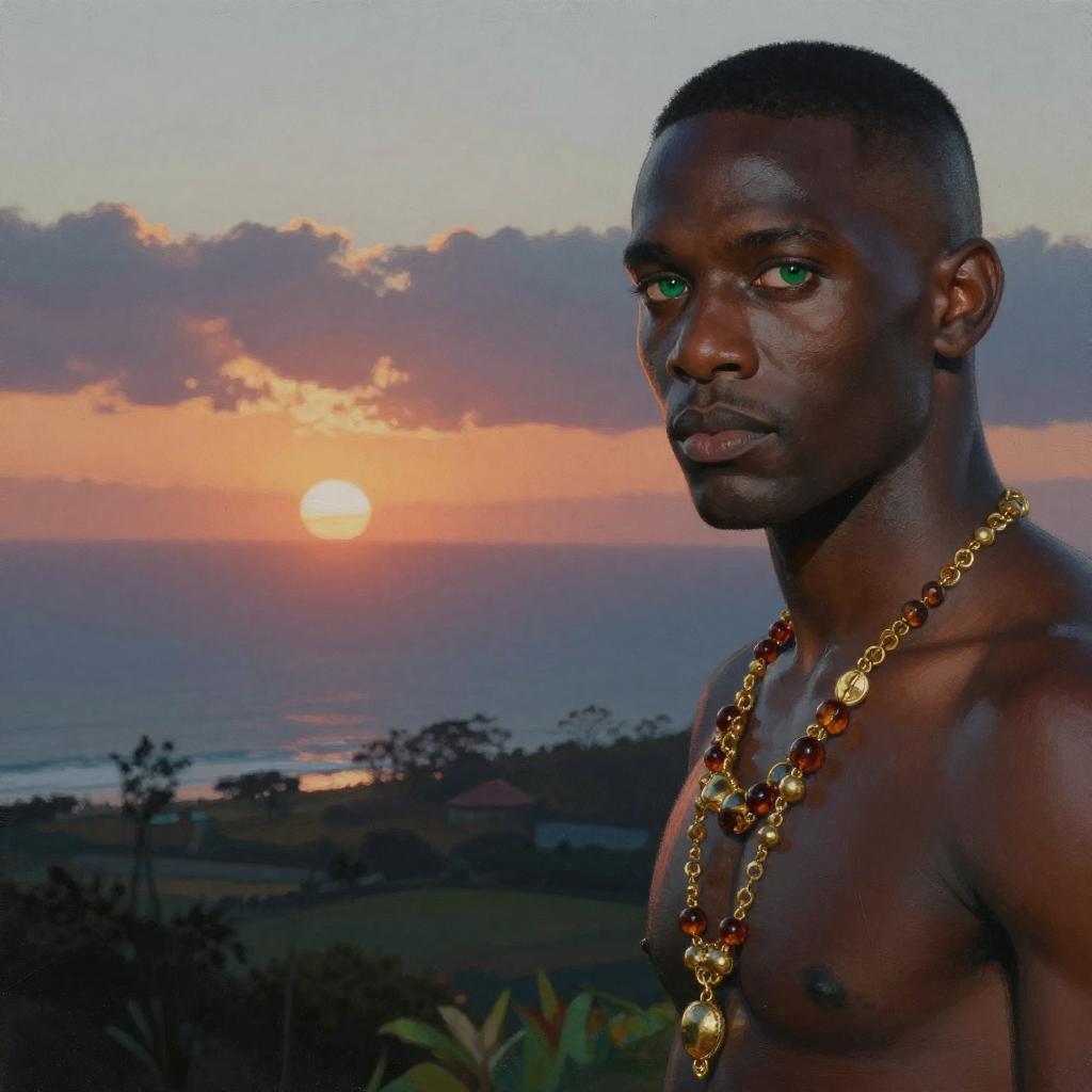 A landscape painting of a a sunset over Hawaii, inkpunkLandscapes768, f/1.4, square image, close up film photo, portrait of a male, jet black partial shaved, green eyes, amber and gold jewelry, elegant pose, atmospheric lighting, cinematic composition, detailed, winter, filmgenre__