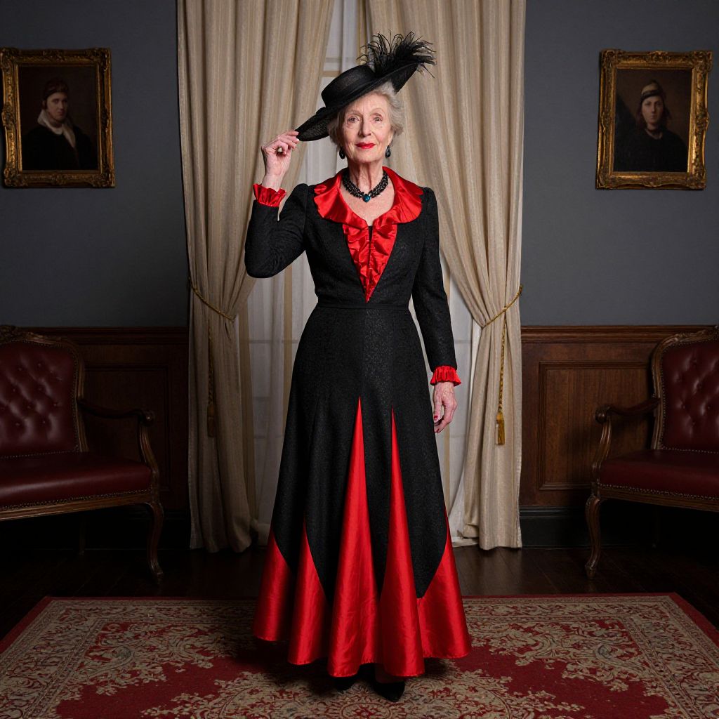 Peel And Stick a full body portrait of a rich elderly Victorian woman wearing wealthy dark brown clothing, smirking,