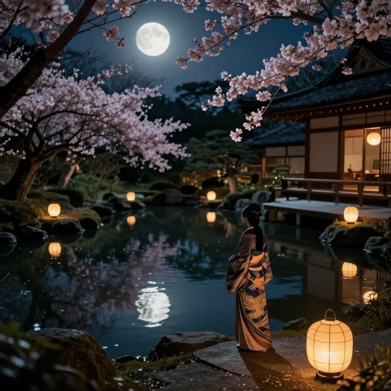 Photograph of a serene Japanese garden at night. A koi fish with black and white patterns and a bright orange spot swims in a tranquil pond, creating gentle ripples. Pink cherry blossoms frame the top of the image, reflecting softly in the water. Two warm yellow lanterns light up the moss-covered stone pathway on the right, illuminating the scene. The pond's surface is dark blue, with the full moon casting a glowing reflection. White cherry blossom petals float around, adding a delicate touch to the peaceful setting.