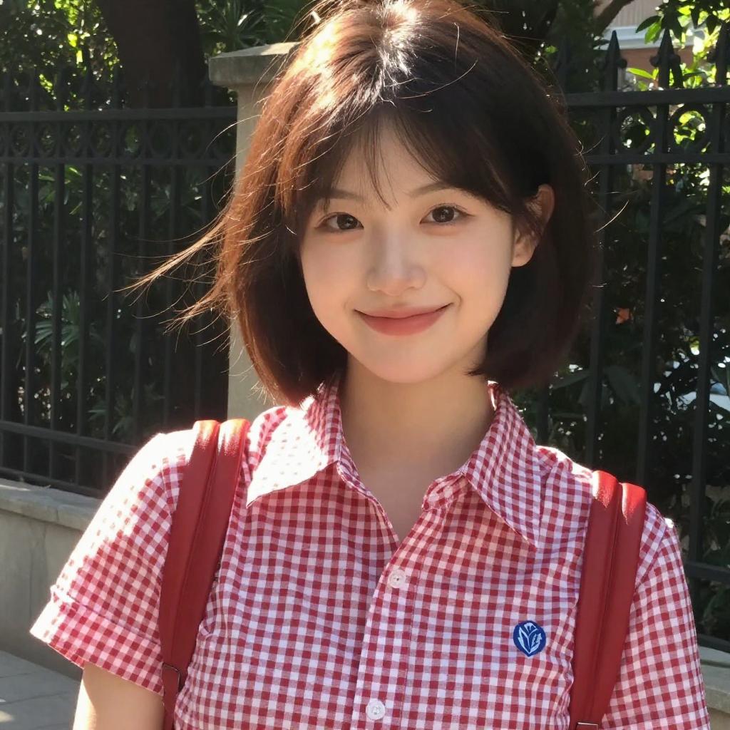 Photograph of a smiling young woman with fair skin and dark brown hair in a blunt bob. She wears a red and white checkered short-sleeve shirt with a small blue emblem on the chest. She has a red shoulder bag strap over her right shoulder. Sunlight illuminates her face and hair, casting soft shadows. The background includes a blurred black iron fence and trees.