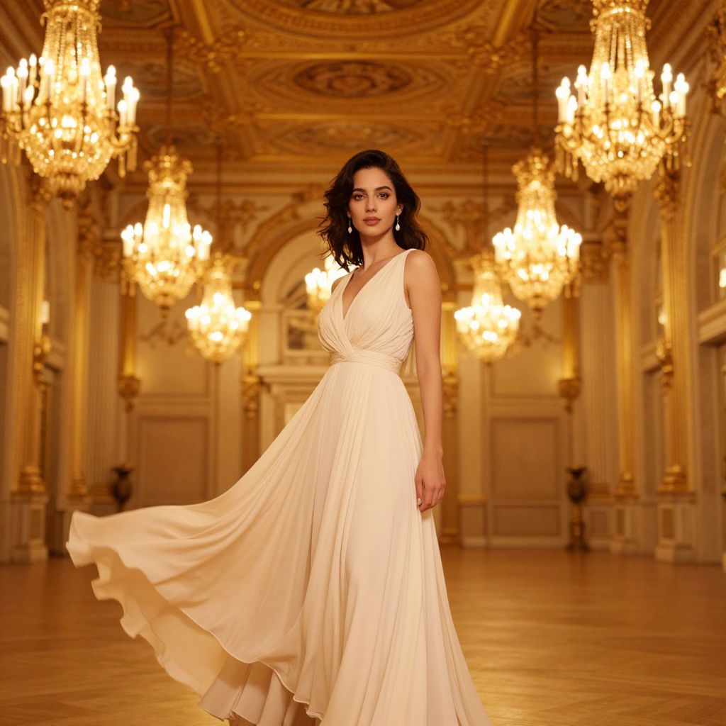 A graceful woman wearing a flowing cream-colored gown stands in a luxurious grand ballroom. The room features golden chandeliers casting warm light, ornate architectural details, and a rich wooden parquet floor, embodying an art nouveau style with a classic yet timeless ambiance.