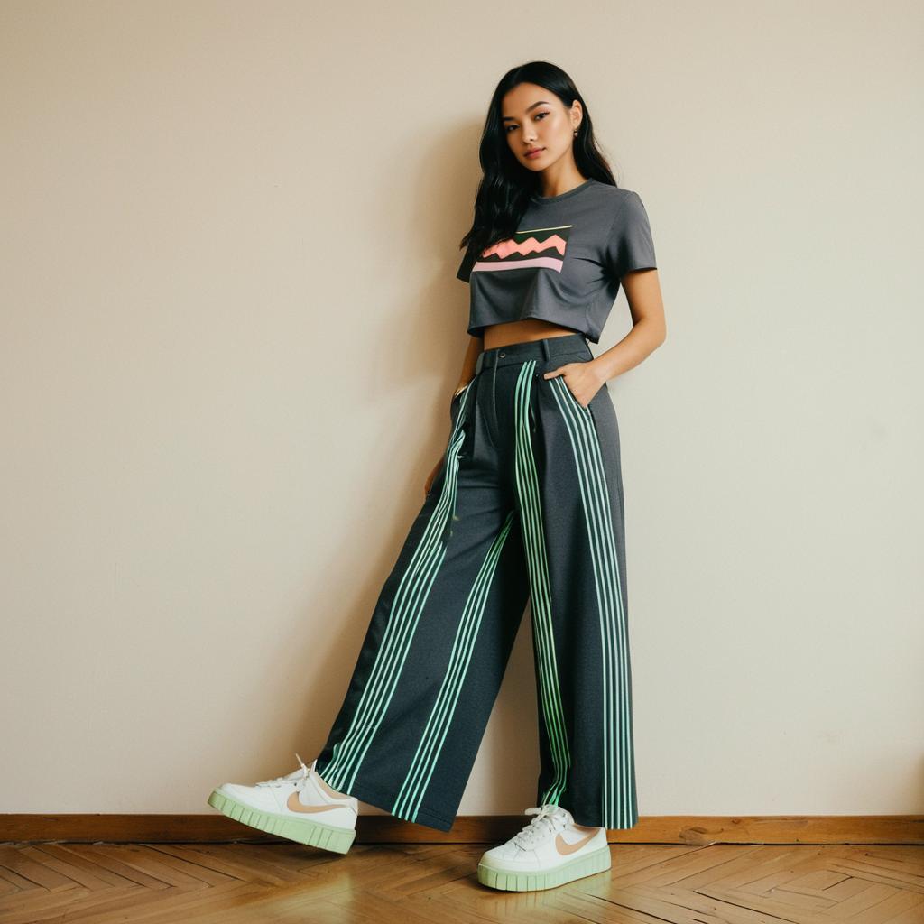 Sexy Woman, contemporary casual, off-white silk camisole with lace trim and thin straps, black leather mini skirt with front zipper and silver studs, black strappy stilettos with ankle straps, circular neon light studio background. Sexy body, big breasts. --sref 1399