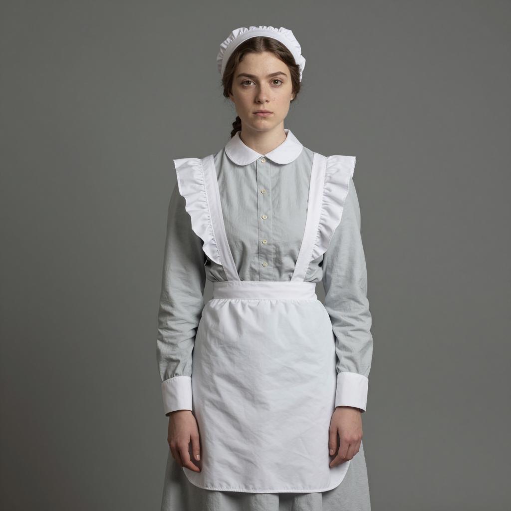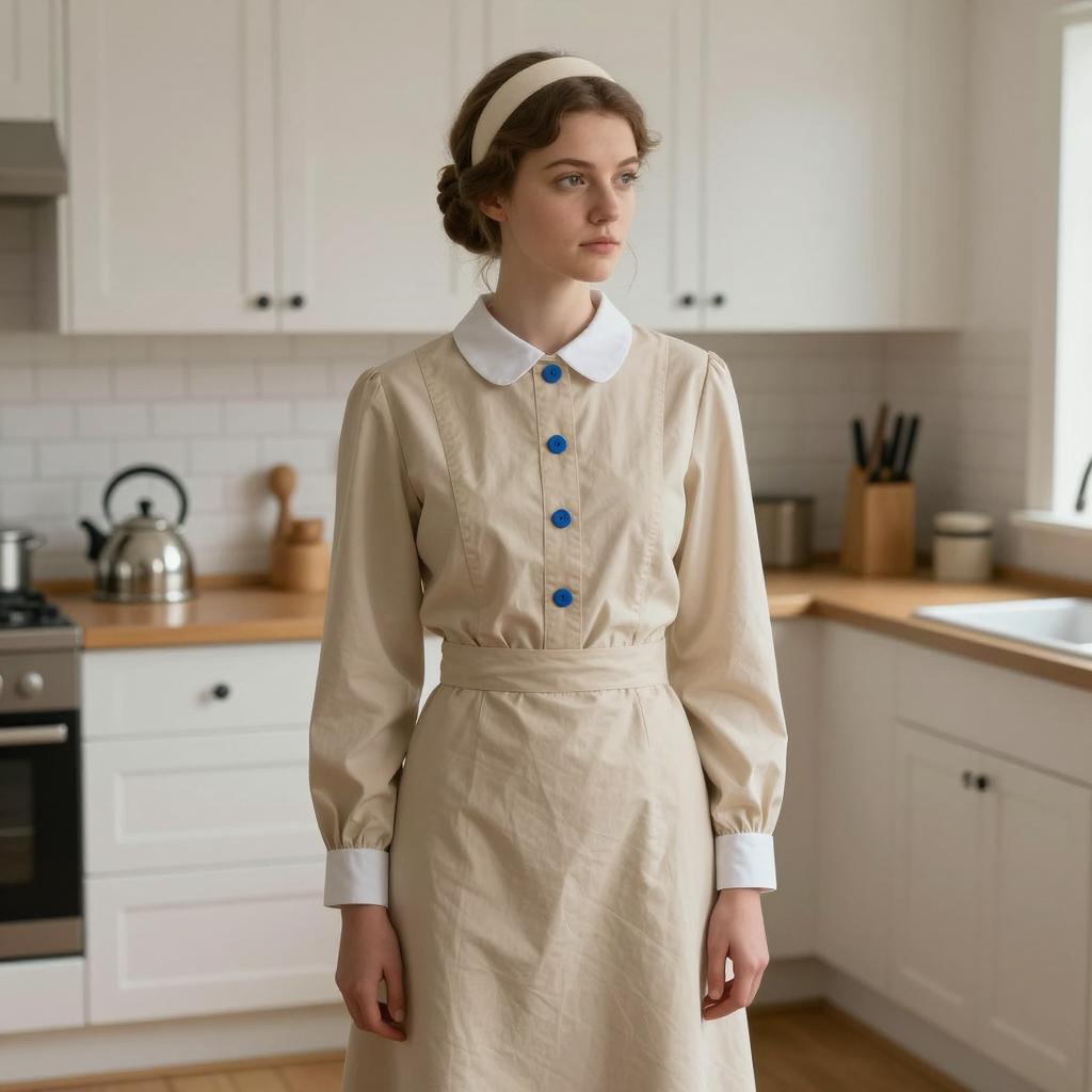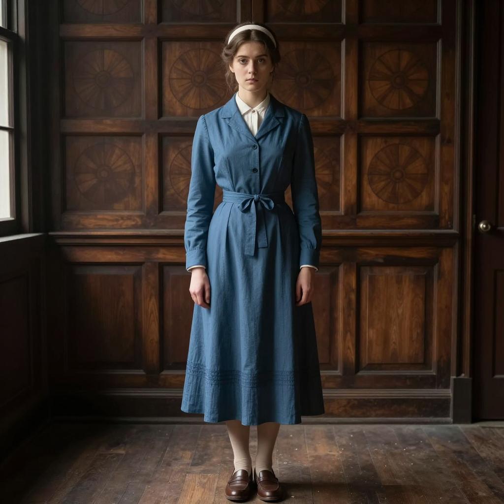 Vintage attire woman costume, photograph of a young woman standing in a dimly lit, ornate room, wearing a vintage-style blue dress with a belted waist and long sleeves, white shirt underneath, brown loafers, brown hair tied back with a white headband, serious expression, wooden panel walls with a circular pattern in the background, natural light from the left, realistic, vintage, early 20th century fashion, full body shot, standing position, centered in frame, detailed ures, historical setting