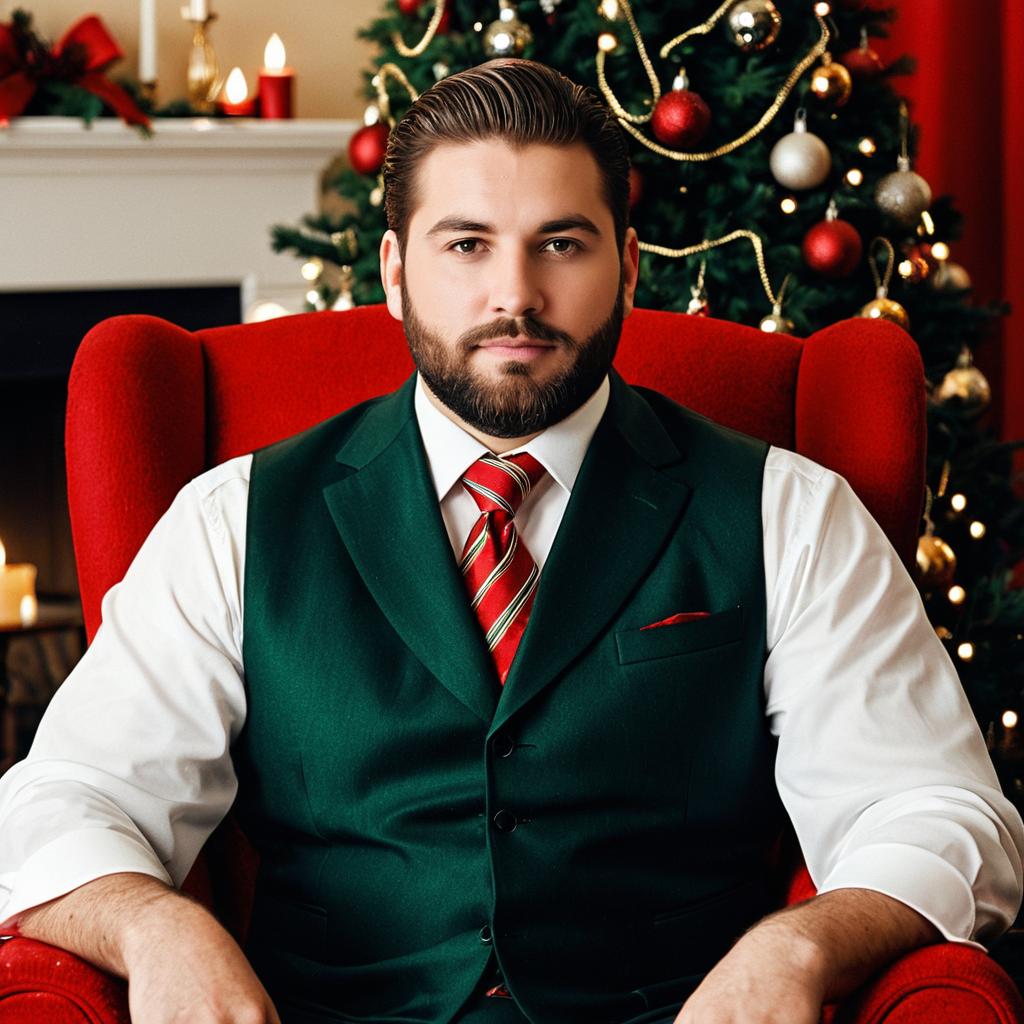 Man big tall christmas suits,1boy, male focus, solo, christmas tree, necktie, sitting, formal, suit, christmas, candle, realistic, facial hair, vest, red necktie, chair, christmas ornaments, looking at viewer