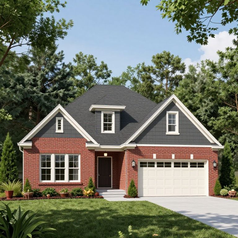 Craftsman-style house plan featuring a front elevation with a dark gray roof, red brick accents, and a two-car garage, surrounded by tall evergreen trees and a neatly landscaped yard.