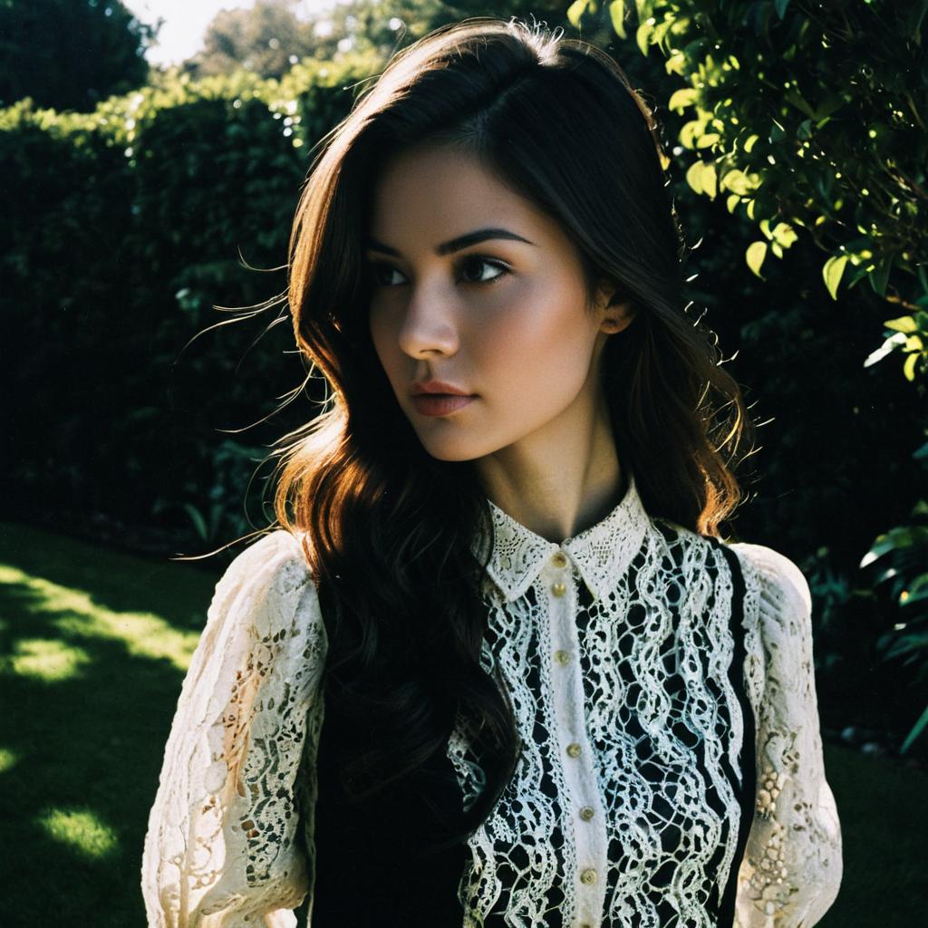 Portrait of a young woman with long layered dark hair, wearing an elegant lace blouse with intricate patterns and pearl buttons. She is outdoors in a lush garden setting, captured in fashion editorial style with dramatic shadows highlighting her facial features and hairstyle.