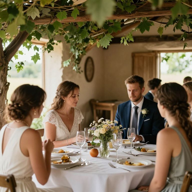 An intimate rustic wedding reception exudes serenity and warmth, where the gentle rustle of leaves, the soft fragrance of wildflowers, and the promise of shared moments create a timeless celebration of connection and joy.