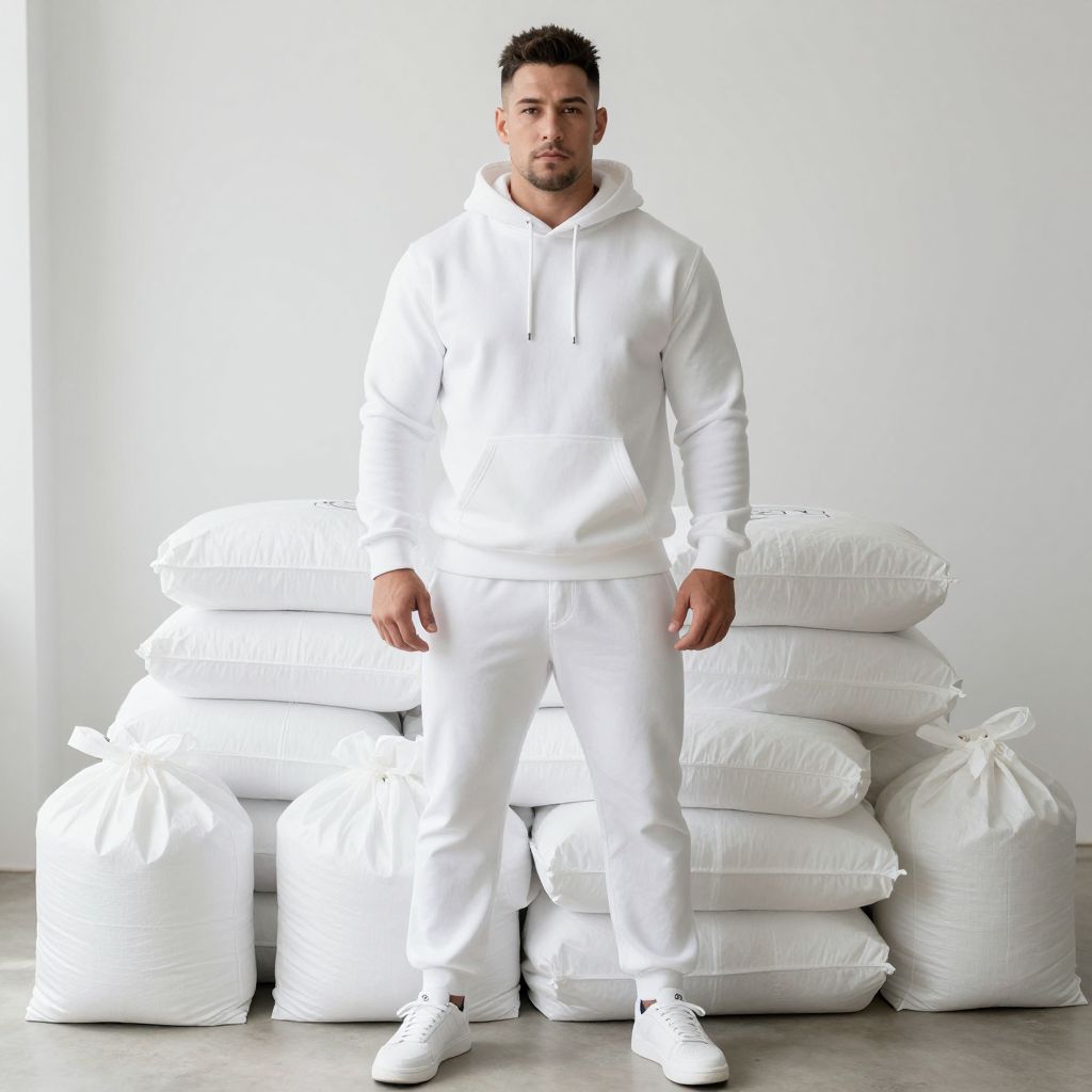 A man wearing a white hoodie and white pants is standing in front of a pile of white bags. The man has a muscular build, a strong jawline, and a confident expression. The scene is set in a clean, minimalist environment with soft natural light illuminating the surroundings. The white bags are neatly stacked, creating a stark contrast against the man's clothing, emphasizing his presence and the simplicity of the setting.