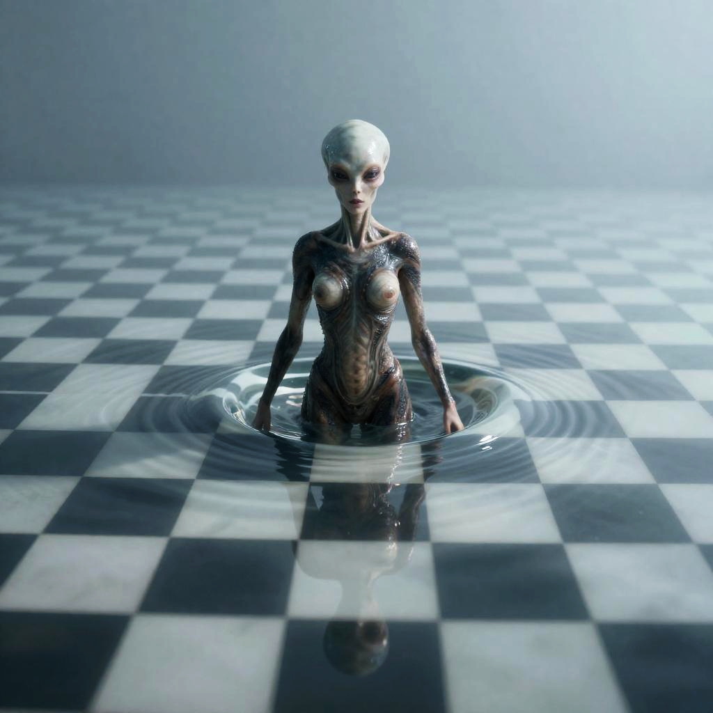 This digital CGI image depicts a humanoid alien with a shiny, bald head and pale, smooth skin, standing waist-deep in a black and white checkered water pool. The alien has a slender, androgynous physique with visible breasts and no visible genitals. Water ripples surround its lower body. The background is a gradient of light blue to white, creating a surreal, otherworldly atmosphere. The alien's expression is neutral, and its eyes are large and dark, adding to its eerie appearance. The image has a high-contrast, hyper-realistic style, emphasizing the alien's smooth texture and the reflective water surface.