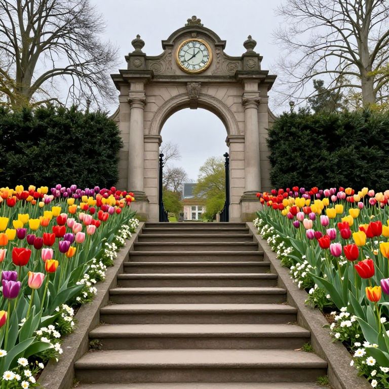Stately stone steps ascend toward an ornate archway crowned by a classic clock, flanked by vibrant gardens of tulips and daisies in full bloom, creating a serene yet surreal juxtaposition of nature and architecture.