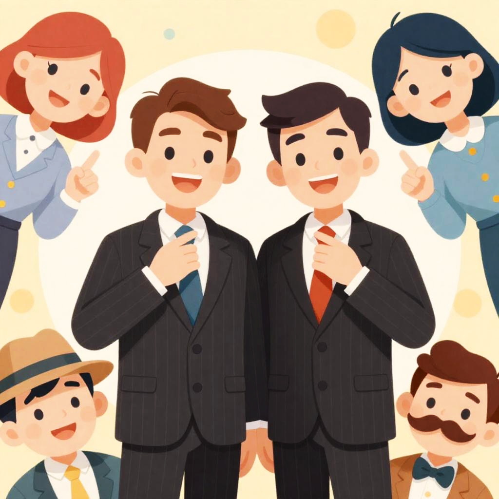 Colorful cartoon illustration of two men in pinstripe suits, center foreground, adjusting ties. Both smiling, middle fingers pointing upward. Surrounding characters: woman with red hair top left, man in hat bottom left, woman in blue top right, man with mustache bottom right. Bright, playful background with circular patterns.