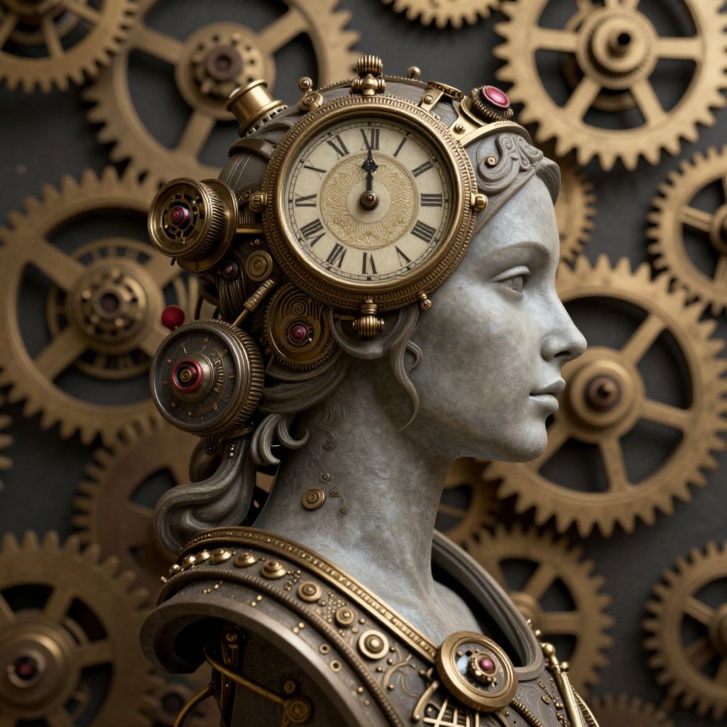 A steampunk-inspired bust of a serene woman's profile emerges from a backdrop of intricate mechanical gears, with a vintage clock face seamlessly integrated into her forehead, symbolizing the fusion of human thought and temporal mechanics.