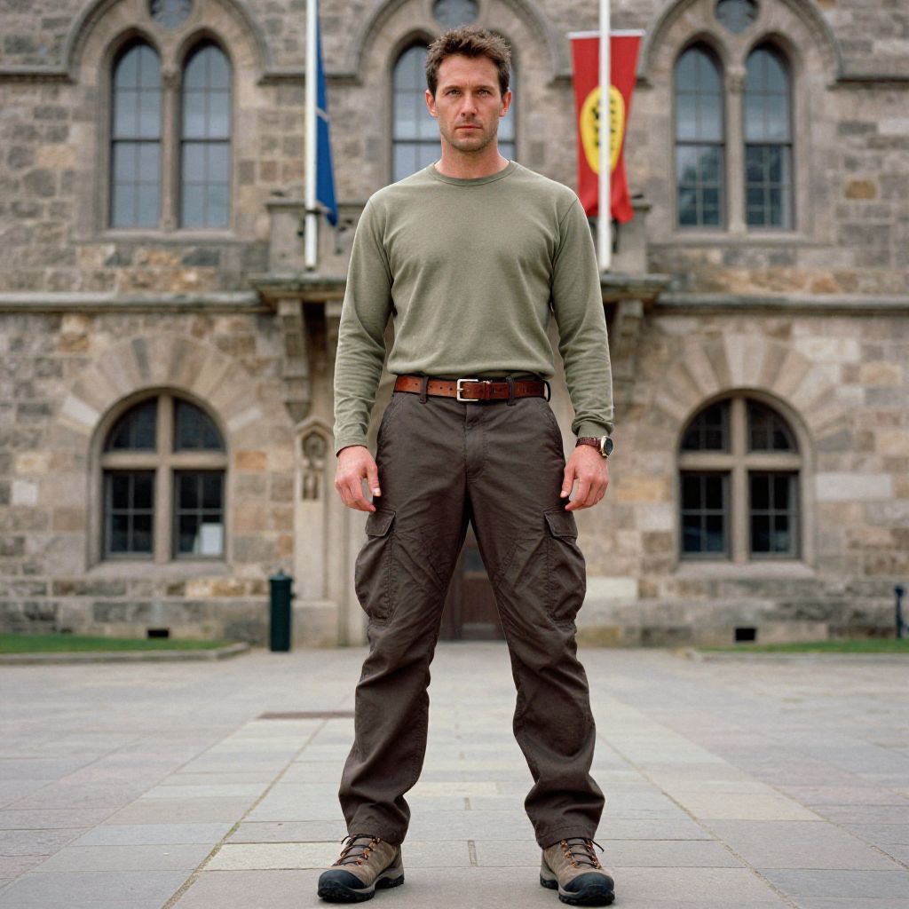 Photograph of a Caucasian man with short brown hair, standing in front of a stone building with arched windows. He has a muscular build, wears a long-sleeved, olive-green shirt, brown cargo pants with a brown belt, and black shoes. His expression is neutral. The background includes three flags: blue, white, and red with a yellow emblem. The stone building has a textured, greyish-brown facade with large, arched windows. The ground is paved with grey tiles. The lighting is natural, suggesting an outdoor setting.